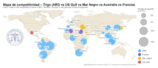 La mencionada dinámica de precio se plasma en la cantidad de destinos donde el trigo argentino es la opción más conveniente dado su precio FOB y el costo de traslado marítimo. El mapa de competitividad del trigo está en su mayoría pintado de celeste, con una imponente presencia en mercados que no son tan habituales y disputando otros que por cercanía tienen a Francia, Rusia, Australia o Estados Unidos como principal referencia.