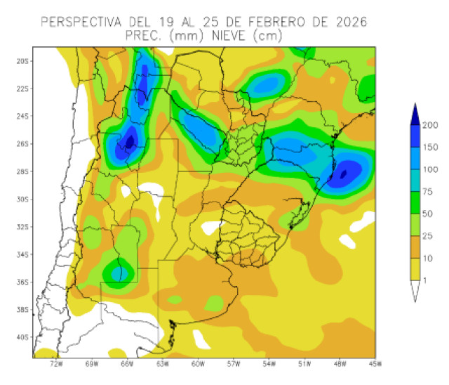 El este y el centro del NOA, la mayor parte del Paraguay, la Región del Chaco, el norte y el centro de la Mesopotamia, el norte de Cuyo, el noroeste y el sudeste de la Región Pampeana recibirán aportes moderados a abundantes (10 a 50 mm), con focos de tormentas con precipitaciones superiores a 100 mm.