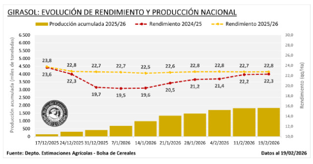 Por último, la cosecha de girasol entra en pausa a la espera de que los lotes tardíos de la zona primicia alcancen la humedad de cosecha. Las labores marcaron un progreso de solo 0,2 p.p. y cubren el 30,1 % del área apta, reflejando un adelanto respecto al avance promedio histórico de 7,2 p.p. El rendimiento promedio nacional se mantiene en 22,8 qq/Ha, permitiendo sostener la proyección de 6,2 MTn. La heterogeneidad de escenarios sobre el centro y sur del área agrícola, producto de la errática distribución de las lluvias sumada a la amplitud de la ventana de siembra de la oleaginosa, refleja gran variabilidad en la condición de cultivo y por ende en las expectativas relacionadas con la productividad. En estos sectores, el 45,5 % de la superficie se encuentra en madurez, y esperan iniciar la cosecha a partir de la semana próxima.