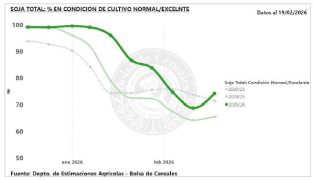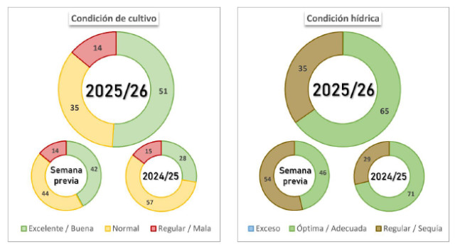 La condición hídrica Óptima/Adecuada mejoró 10 p.p. Con el 72 % de la soja de primera transitando el período crítico y mejores reservas de humedad, sostenemos la proyección de producción en 48,5 MTn.