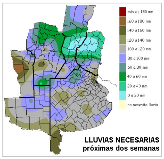 Como podemos observar, gran parte de la provincia de BA, más que nada del centro para el sudeste, presenta una situación homogénea, con un nivel de demanda altamente improbable de satisfacer. Esto se repite en corredores que van desde el sur de CB hacia la zona de influencia de Venado Tuerto, todas zonas que requieren unos cien milímetros en los próximos quince días. Aun considerando las aproximaciones en el cálculo, la demanda de precipitaciones es muy elevada. Nuevamente aparece la napa como un auxilio difícil de evaluar, pero que posiblemente en algunos sectores esté presente.