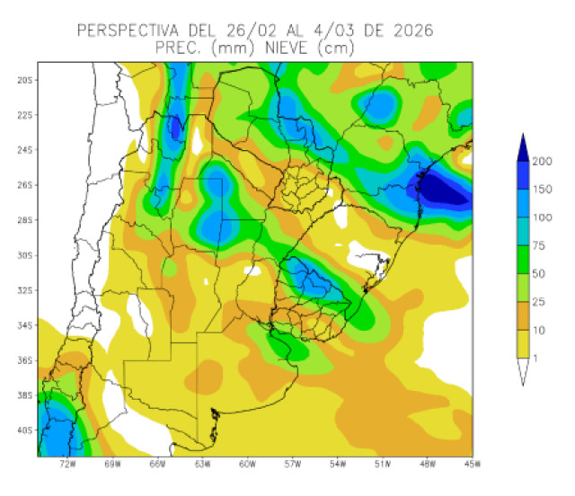 La perspectiva comenzará con el paso de un frente de tormenta, produciendo lluvias muy desparejas, con valores abundantes en el norte del Paraguay, el NOA, el sur de la Región del Chaco, el centro de la Mesopotamia, el norte del Uruguay, y las costas del Río de La Plata, pero dejando a la mayor parte del área agrícola con registros moderados a escasos.