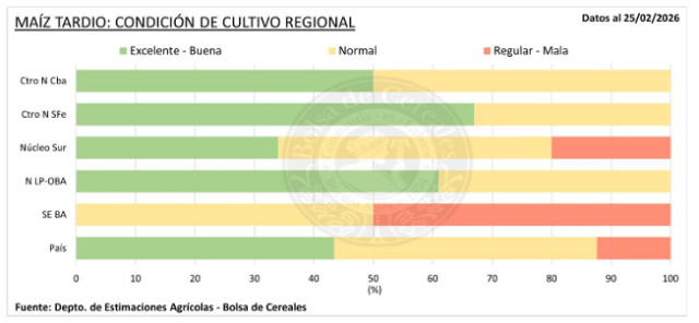 En paralelo, ambos Núcleos y el Centro-Norte de Córdoba iniciaron las labores de recolección, mientras que en el Centro-Este de Entre Ríos las tareas se retoman gradualmente tras las precipitaciones registradas a fines de la semana pasada. En cuanto al maíz tardío, se registra una mejora intersemanal de 6,6 p.p. en la condición hídrica, un cambio especialmente favorable considerando que a nivel nacional el 94,1 % de los planteos se encuentra desde panojamiento en adelante, etapa en la que la disponibilidad de agua resulta clave para transitar el período crítico. En este contexto, el 87,6 % del área relevada presenta una condición de cultivo que se ubica entre Normal y Excelente. Frente a este panorama, mantenemos nuestra proyección de 57 MTn.