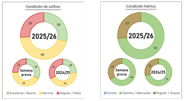 Finalmente, se da por terminada la siembra de sorgo granífero tras un progreso interquincenal de 1,7 p.p. En paralelo, los lotes más tempranos del Centro-Norte de Santa Fe y del Núcleo Norte avanzan hacia el final del ciclo y se encuentran próximos a iniciar las labores de cosecha. A nivel nacional, el 85,8 % del área relevada presenta una condición de cultivo entre Normal y Excelente, y sobre el centro y sur del área agrícola el cultivo continúa su desarrollo en etapas reproductivas, a la espera de condiciones hídricas que acompañen adecuadamente el llenado de granos.