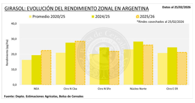 A su vez, el 31 % del girasol se encuentra cosechado tras un progreso intersemanal de cosecha de 0,9 p.p., sosteniendo la actual proyección de producción en 6,2 MTn. El Centro-Este de Entre Ríos se suma a las zonas que finalizaron la recolección, con un rinde promedio que supera al promedio de las últimas 5 campañas en un 2 %. A su vez, el resto de las zonas que siguen en cosecha, muestran rindes superiores al promedio del último quinquenio, y en el caso de la provincia de Córdoba, superiores al máximo histórico. En cuanto a las expectativas de lo que queda en pie, los rindes presentan gran variabilidad entre planteos tempranos y tardíos, y se espera a iniciar la cosecha para confirmar resultados.