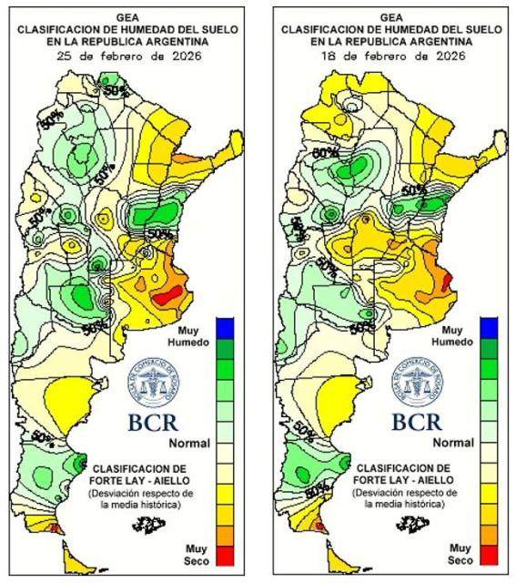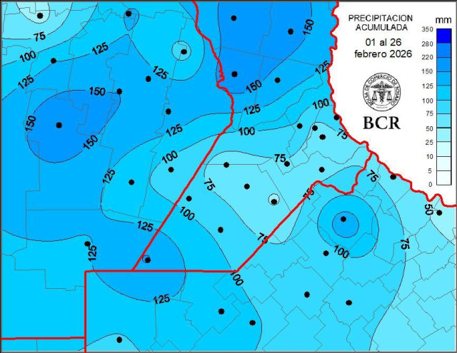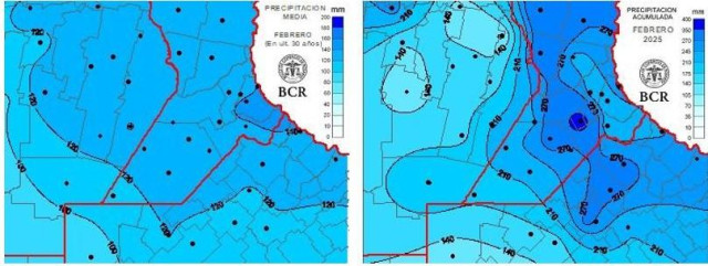 En el mes de febrero, las lluvias de la región núcleo alcanzaron un promedio de 103 mm, cuando los promedios para la región oscilan entre 100 y 140 mm de oeste a este. Los mayores registros mensuales los recibió una zona la zona central del oeste y otra en el noreste: Montes de Oca con 177 mm, Bengolea con 171 mm, y Carlos Pellegrini con 167 mm. Por otro lado, hay un 30% área en donde el agua resultó insuficiente para reactivar la recuperación de los cultivos, con acumulados por debajo de los 80 mm. Se trata de un corredor que se extiende por debajo de Rosario hacia el oeste y el sur.