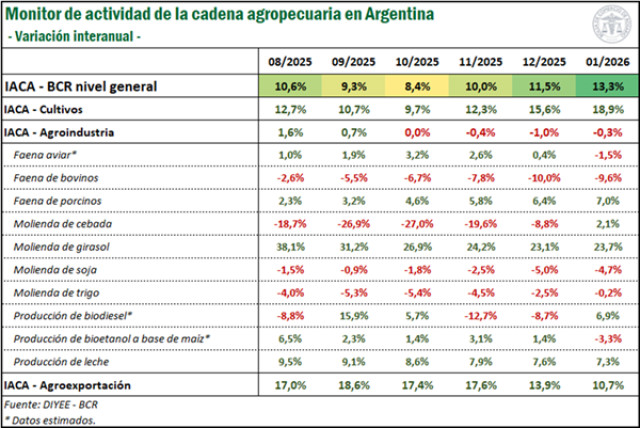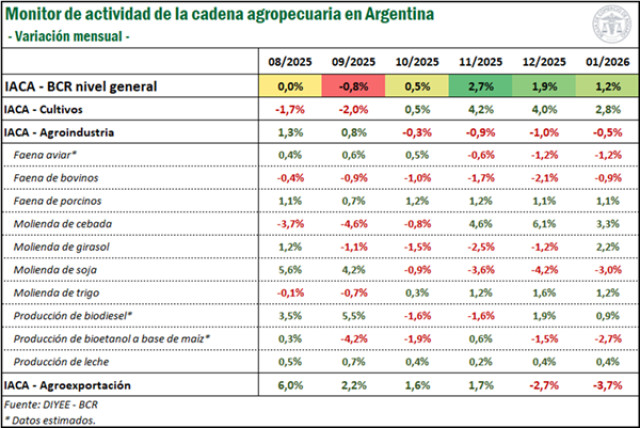 El Índice de Actividad de la Cadena Agropecuaria (IACA-BCR), que elabora la Bolsa de Comercio de Rosario, registró un incremento mensual del 1,2% en enero, alcanzando un nuevo máximo histórico. En la comparación interanual, la serie se ubica 13,3% por encima del primer mes de 2025.