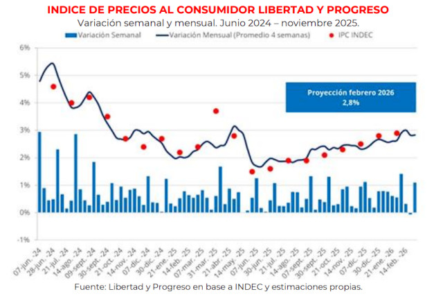 Clara Alesina, Economista de la Fundación Libertad y Progreso, sostiene que "En los últimos meses la inflación se aceleró por factores estacionales y por el rezago de la suba del tipo de cambio. En febrero vemos una leve pausa: proyectamos 2,8%, con desaceleración respecto a enero y el primer registro de desinflación semanal en nuestra serie.