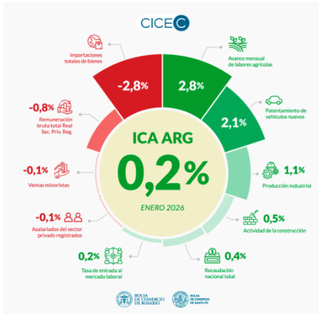 El Índice Compuesto Coincidente de Actividad Económica de Argentina (ICA-ARG), elaborado por las Bolsas de Comercio de Rosario y Santa Fe, registró en enero una variación mensual del 0,2%, positiva por segundo mes consecutivo luego del repunte observado en diciembre. En la comparación interanual, el indicador se ubicó 1,1% por debajo del nivel de enero de 2025.