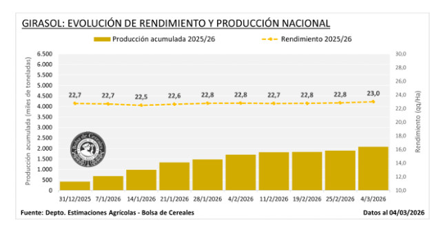 El progreso intersemanal de cosecha fue de 2,8 p.p., cubriendo el 33,8 % del área apta. El rinde promedio nacional asciende a 23 qq/Ha, manteniendo la proyección de producción en 6,2 MTn.