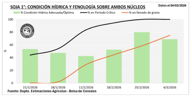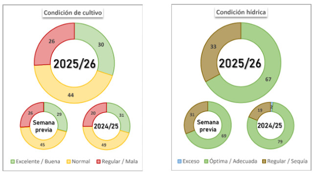 Sin embargo, la condición hídrica Óptima/Adecuada disminuyó en -2 p.p., ya que gran parte de Chaco, el norte de Santa Fe y el centro y sur de Buenos Aires aún requieren nuevas precipitaciones. En este contexto, el 74 % de lo implantado presenta una condición de cultivo Normal/Excelente, mostrando mejoras tras las últimas lluvias. A su vez, el 27 % de la soja de primera inició el llenado de grano a la expectativa de nuevas precipitaciones que permitan sostener su potencial de rinde. En paralelo, el 40 % de la soja de segunda transita el período de definición de rendimiento con limitantes hídricas, especialmente sobre ambos núcleos. Bajo este escenario, sostenemos la proyección de producción en 48,5 MTn.