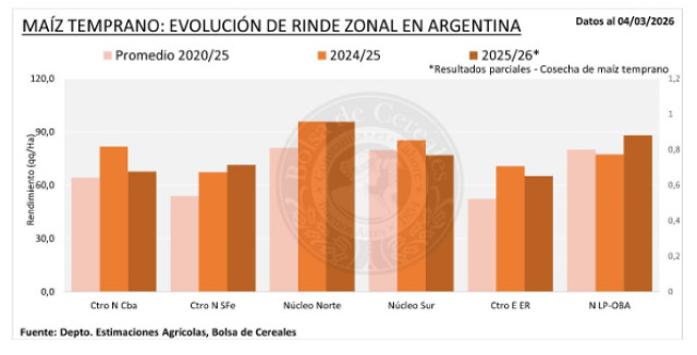 La cosecha de maíz temprano alcanza un 7,2 % del área apta, con un rinde promedio de 81,3 qq/Ha. Mantenemos nuestra proyección en 57 MTn.