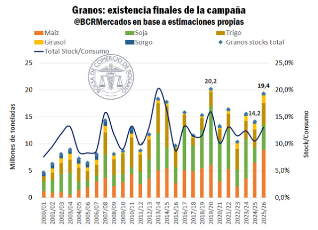 En este nuevo escenario global, el mercado argentino de granos se posiciona con un nivel de oferta sin precedentes, traccionado por la extraordinaria cosecha de trigo y las grandes performances productivas que se esperan para girasol y maíz. En base a las estimaciones de demanda previas al estallido de las hostilidades para esta campaña 2025/26, los stocks finales de granos que quedarían en el mercado argentino llegarían a niveles récords: más de 21 Mt entre maíz, soja, trigo, sorgo y girasol. Cabe destacar que las proyecciones de exportación por trigo y maíz son récord para la campaña y en máximos del siglo para aceite de girasol.