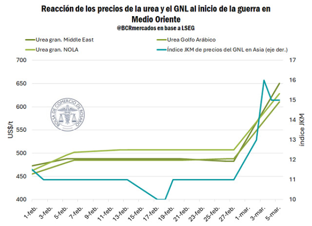En el corto plazo el conflicto en Medio Oriente impacta en los commodities agrícolas principalmente a través del costo y la disponibilidad de insumos, con los fertilizantes como foco central. En particular, el virtual bloqueo del Estrecho de Ormuz restringe una vía por la que circulaba cerca de un tercio de las exportaciones mundiales de fertilizantes. En paralelo, el gas natural es uno de los productos más afectados desde el inicio de las hostilidades y resulta una variable crítica para el mercado: explica aproximadamente el 80% del costo de producción de urea.