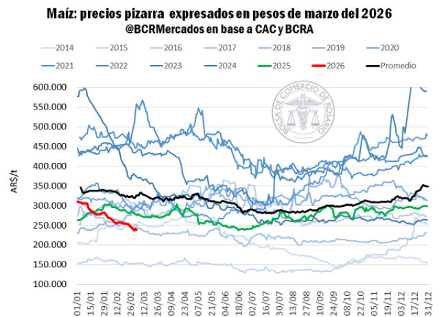 Si bien el maíz fue el producto que menos subió en Chicago, en el mercado local la presión a la baja se sintió con fuerza a medida que las cosechadoras avanzan sobre los lotes. En los últimos siete días se descargaron 800.000 toneladas de maíz sobre los puertos del Gran Rosario, un salto intersemanal del 141% y 2,6 veces más que el promedio de los últimos cinco años a inicios de marzo. El maíz temprano será protagonista este año y la logística un factor clave.