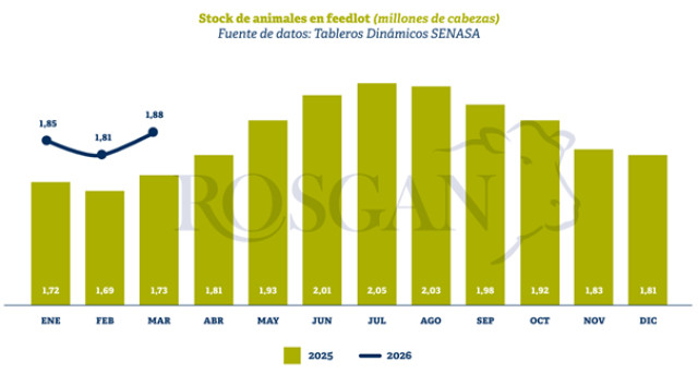 Según datos del SENASA, al 1° de marzo los feedlots reportaban 1,88 millones de cabezas, un 9% más que en 2025, cuando se había registrado otro récord histórico de 1,73 millones de cabezas para la misma fecha
