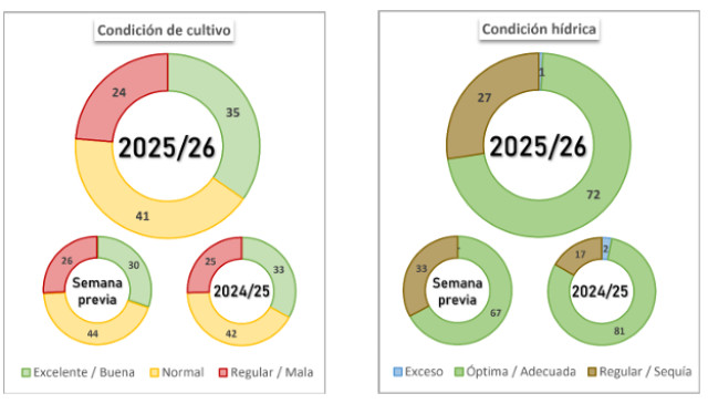 La condición hídrica Adecuada/Óptima alcanza el 72 % del área, mientras que la condición de cultivo Normal/Excelente se ubica en el 76,2 %. Bajo este escenario, sostenemos nuestra proyección de producción en 48,5 MTn.