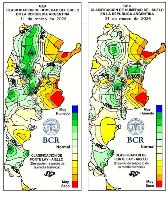 La mayor parte de la soja de 2da se encuentra entre plena formación de chauchas y llenado de granos. La ocurrencia de nuevas lluvias aún podrían favorecer el llenado y mejorar los rindes finales en parte de la región. En Carlos Pellegrini, con lluvias en los próximos días, el cultivo todavía podría expresar gran parte de su potencial, con estimaciones cercanas a 35 qq/ha. En Bombal, el rinde proyectado ronda los 38 qq/ha, y los técnicos señalan que un nuevo aporte de agua podría mejorar ese escenario. Sin embargo, en otras zonas, el daño provocado por la sequía ya resulta difícil de revertir. En Colón explican que el trigo previo extrajo una importante cantidad de agua y nutrientes, parámetros que no llegaron a recomponerse. Por eso, cuando se interrumpieron las lluvias, el rinde cayó rápidamente. Allí estiman promedios de 30 qq/ha al sur de la ruta 8 y cerca de 20 qq/ha hacia el norte, en dirección a Pergamino. En María Susana proyectan rindes al menos 20% por debajo de un año normal, mientras que en Aldao se estiman valores cercanos a 20 qq/ha. En Bigand y Marcos Juárez, las lluvias de febrero no lograron recomponer el cultivo y la proyección promedio se ubica en 25 qq/ha.