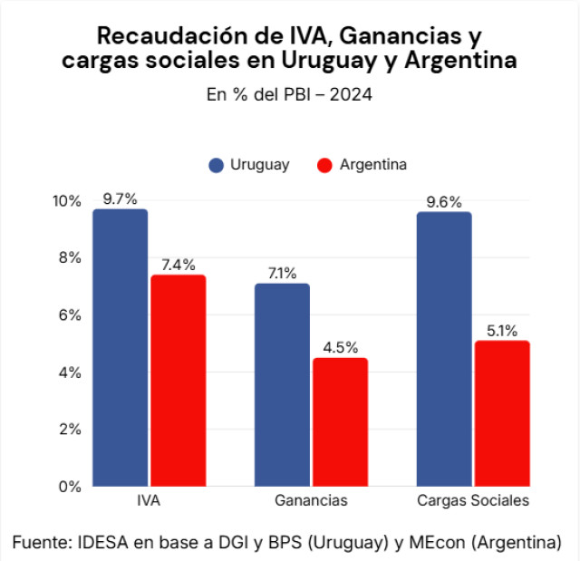 En Uruguay el IVA recauda 9,7% del PBI, mientras que en Argentina recauda 7,4%.