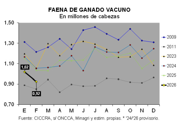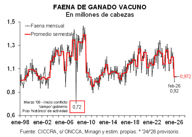 En febrero de 2026, y al igual que en enero, la industria frigorífica tuvo uno de los niveles de actividad más bajos de los últimos cuarenta y siete febreros, ocupando el puesto Nº 37. Un total de 337 establecimientos faenó 924,3 mil cabezas de hacienda vacuna, guarismo que resultó 1,5% mayor al de enero, corregido por el número de días laborables, pero que se mantuvo 10,7% por debajo del nivel de actividad registrado en febrero del año pasado (-110,35 mil cabezas).
