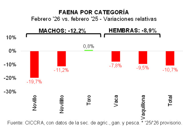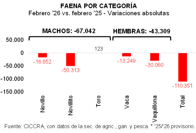 La faena de machos sumó 1,017 millones de cabezas en el período analizado, es decir 12,7% menos que la registrada en enero-febrero de 2025 (-148,63 mil cabezas). La caída de la faena de novillitos fue la que más tracción ejerció (-11,4% anual; -108,94 mil cabezas). Por su parte, la faena de novillos descendió 22,2% anual (39,86 mil cabezas).