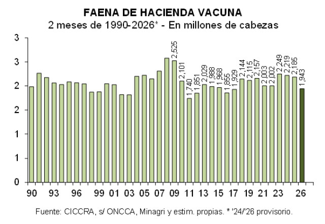 En el primer bimestre de 2026 operaron 345 establecimientos según la estadística oficial, faenando un total de 1,943 millones de vacunos, es decir 11,1% menos que en el mismo bimestre de 2025 (-242,19 mil cabezas). Los frigoríficos que cuentan con habilitación del Senasa faenaron 1,526 millones de cabezas en dos meses, lo que representó 78,5% del total. El nivel de actividad promedio por planta fue equivalente a 11.920 cabezas en dos meses (5.960 cabezas promedio/mes). En tanto, las restantes 217 plantas faenaron 417,29 mil cabezas (21,5% del total), lo que arrojó un promedio por establecimiento de 1.923 cabezas en dos meses (962 cabezas promedio/mes).