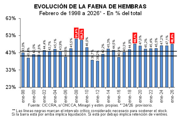 En el primer bimestre del año, la importancia de las hembras en la faena total fue de 47,7% (cuarto registro más elevado en las últimas décadas), sosteniéndose bien por encima del rango compatible con el mantenimiento del rodeo vacuno.