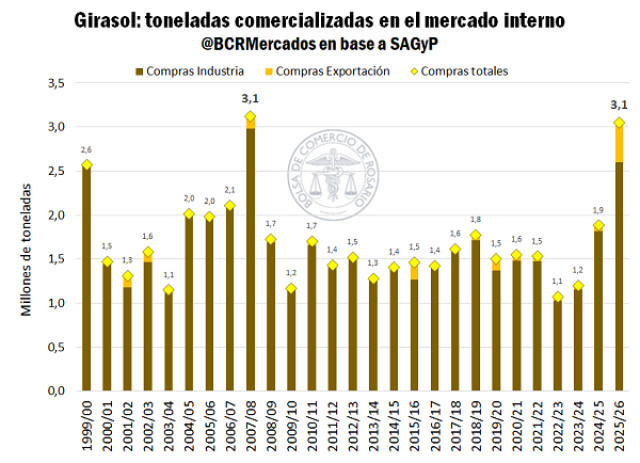 Por supuesto, el enorme tonelaje descargado en los puertos de exportación tuvo su correlato directo en el mercado interno. El apetito por la producción argentina se expresó puertas adentro en la forma de compras de totales que llegaron a 3,1 millones de toneladas a esta altura del año. De esta forma, la 2025/26 de girasol anota su segundo registro más alto del siglo, a la par de la 2007/8. Asimismo, y en una comparativa entre campañas, el ritmo comercial es 62% superior al registro de la campaña anterior a esta altura y 111% más que el promedio del último lustro.