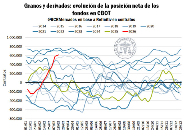 Más allá del recorte en posiciones largas a principios de semanas, los fondos siguen comprados y muy fuerte en commodities agro. La posición neta es comprada en más de 600.000 contratos entre granos y derivados, un aumento del 337% entre fines de enero y la actualidad. Este contexto le otorga un importante poder de fuego a los fondos y explica el nivel de volatilidad al que están expuestos las cotizaciones agro. En una misma rueda, el reordenamiento de cartera ya sea por toma de ganancias, por cambios en expectativas o por alguna noticia que dispare las anteriores pueden tener un impacto violento en el visor de precios.