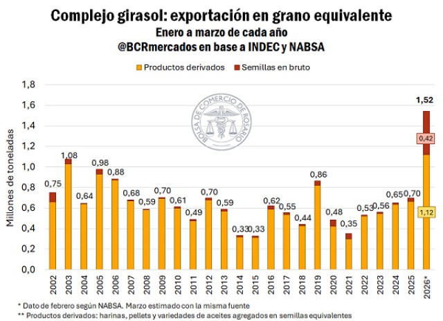 Las exportaciones del complejo girasol rompen todo registro y están en máximos históricos. Con 391.000 toneladas de aceite embarcadas en lo que va del primer trimestre, es el mejor arranque aceitero de campaña desde 2005. Sin embargo, más allá de la extraordinaria performance exportadora de la industria, la exportación de semilla de girasol está marcando números nunca vistos: en lo que va del trimestre, se embarcaron 421.136 tn; 12 veces la cifra del año pasado (31.688 tn) y casi 17 veces el promedio de los últimos cinco años (25.000 tn) a esta altura. En el siguiente gráfico se dimensiona visualmente el registro.