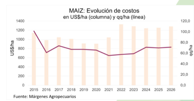 Ante un precio promedio disponible de 167 US$/tn el costo total expresado en quintales (que es una referencia del rinde a lograr para “salir hecho”), se estima en 78,2 qq/ha, muy por encima del costo promedio de 69,5 qq/ha de 2025.