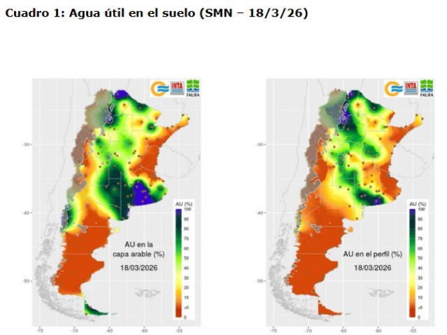 Lluvias de las últimas semanas han recompuesto el perfil hídrico en gran parte del área agrícola argentina, especialmente en el sur de esta. Sin embargo, serán necesarias lluvias abundantes para reponer el perfil del suelo en la totalidad del área en vistas de la próxima siembra de cultivos de invierno. En el siguiente cuadro se muestran datos de la Humedad de Suelo al 18/03/25.