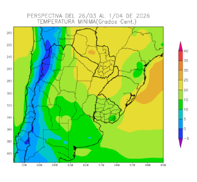 El nordeste del NOA, la Región del Chaco, el norte de Cuyo, la mayor parte del Paraguay y el norte y el centro de la Mesopotamia observarán temperaturas mínimas superiores a 15°C, con un foco con valores superiores a 20°C que se ubicará sobre el noroeste del Paraguay y otros focos con valores inferiores.