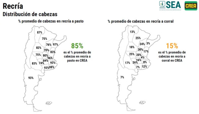 El porcentaje promedio de cabezas en recría a pasto en empresas CREA es del 85%, con los máximos niveles registrados en las regiones Litoral Norte (97%), Norte de Buenos Aires (96%), Sudoeste y Patagonia (93%). Por su parte, el porcentaje promedio de cabezas en recría a corral en la red CREA es del 15%.