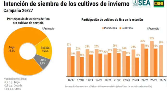 En lo que respecta a las primeras estimaciones preliminares de la superficie de siembra de granos finos en el ciclo 2026/27, se advierte un descenso versus las intenciones informadas en la misma fecha del año de las últimas dos campañas. Crece el atractivo por cultivos alternativos como la colza o la avena.