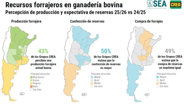 El 43% de los grupos CREA pecuarios perciben una producción forrajera actual buena, especialmente aquellos localizados en el norte de la región pampeana y el norte argentino.