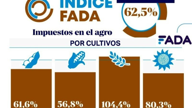 El Índice FADA de marzo 2026 marca que el 62,5% de la renta se va en impuestos, 6,1 puntos porcentuales más que diciembre de 2025. Esto significa que, de cada $100 que genera una hectárea agrícola, $62,5 se destinan a impuestos nacionales, provinciales y municipales. Mientras el promedio nacional es de 62,5%, Córdoba registra un 60,2%, Buenos Aires 60,4%, Santa Fe 57%, La Pampa 60,4%, Entre Ríos 67,6% y San Luis 55,7%.