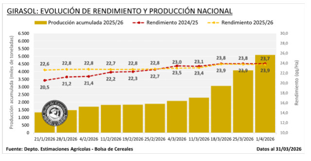 Tras un progreso intersemanal de 15,4 p.p., se encuentra cosechado el 76,5 % del área apta. El rinde promedio nacional se ubica en 23,7 qq/Ha, y sostiene la proyección de producción en 6,4 MTn.