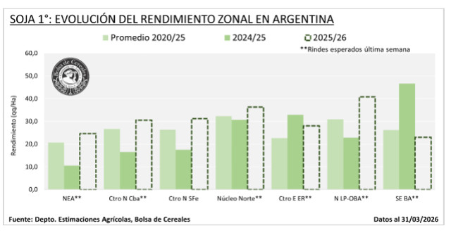 En tanto, la cosecha de soja de primera comienza a generalizarse, con avances del 5 % en el Núcleo Sur y del 9 % en el Núcleo Norte, donde los primeros rendimientos promedian 40 qq/Ha y 35 qq/Ha, respectivamente. En paralelo, la soja de segunda registra un incremento intersemanal de casi 3 p.p. en la condición de cultivo Normal/Excelente, dada las buenas condiciones de humedad, lo que pone un freno al deterioro tras el estrés termo-hídrico durante el verano, principalmente sobre ambos núcleos.