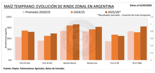 Bajo este contexto sostenemos nuestra proyección de producción en 48,5 MTn. En lo que respecta a maíz, la cosecha continúa avanzando a nivel nacional y, luego de un progreso intersemanal de 3,8 p.p., alcanza el 19 % del área apta. Las labores mantienen un buen ritmo en gran parte del área agrícola, con un rinde promedio nacional que se ubica en 85,3 qq/Ha. A medida que avanza la recolección, continúan registrándose buenos rendimientos en las principales regiones productivas, aunque con variabilidad entre zonas. En cuanto al maíz tardío, la mayor parte del área transitaetapas de llenado de granos, mientras que los primeros lotes ingresan en madurez fisiológica en el Sur de Córdoba y ambos núcleos, en un contexto donde el 73,1 % del área presenta una condición de cultivo entre Buena y Excelente. A su vez, el 94,9 % se encuentra bajo condición hídrica entre Adecuada y Óptima. En este marco, las lluvias registradas en los últimos días han consolidado las reservas, con registros de excesos hídricos en sectores del centro y sur del área agrícola. Frente a este escenario, mantenemos nuestra proyección de 57 MTn.