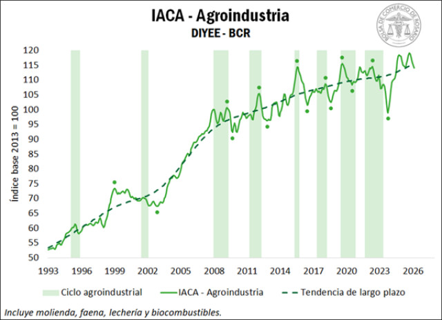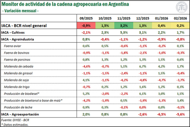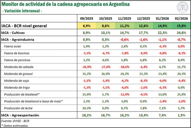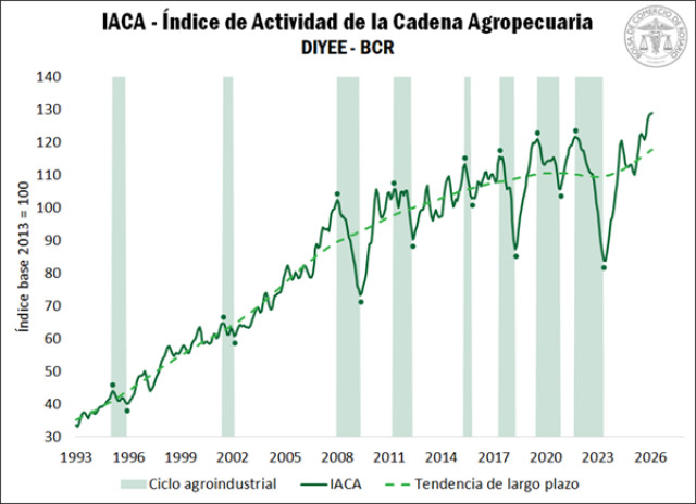 El Índice de Actividad de la Cadena Agropecuaria (IACA-BCR), que elabora la Bolsa de Comercio de Rosario, volvió a crecer en febrero, registrando una tasa de cambio del 0,2% respecto al mes anterior. De esta manera, se posicionó en un nuevo máximo histórico, encadenando cuatro meses consecutivos en niveles récord. En la comparación interanual, la serie se ubicó 15,8% por encima del mismo mes de 2025.