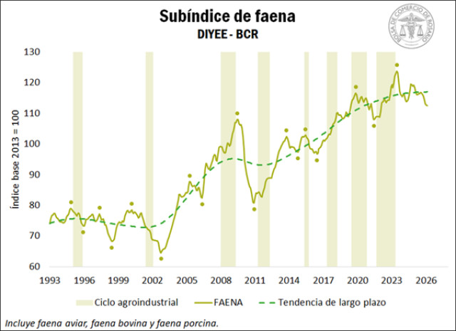 Por su parte, el subíndice de faena mostró su séptima caída mensual consecutiva en febrero, con una tasa del cambio mensual del -0,1%. En este sentido, se advierte que la faena de bovinos continuó con la tendencia bajista que se venía observando en los meses previos, registrando una disminución del 0,3% en febrero. Los informes del sector atribuyen esta caída a una escasez estructural de hacienda provocada por la sequía de años previos que redujo el stock de vientres y limitó el número de terneros disponibles para este ciclo. A este escenario se le suma la decisión estratégica de los productores de retener animales para procesos de recría más largos, con el objetivo de agregarles más kilos antes de la venta debido a una relación de precios favorable.