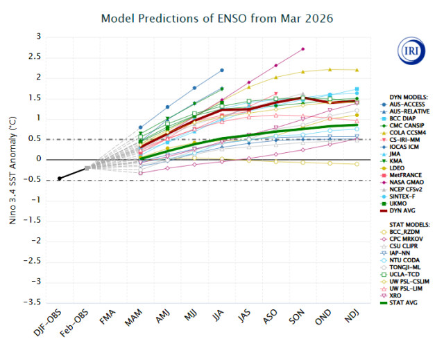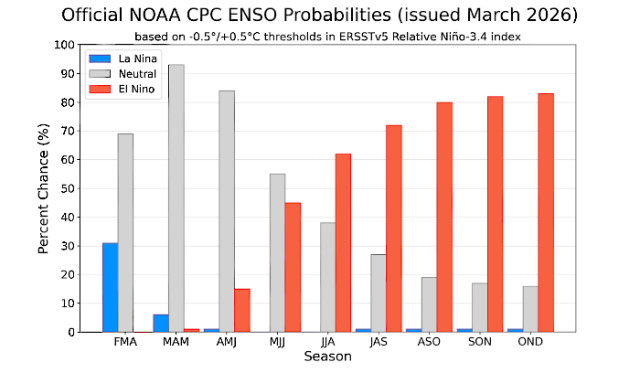 "Hay un 83% de probabilidad de que las condiciones neutrales del fenómeno continúen durante abril-mayo-junio. Pero para el período junio-julio-agosto y hacia la primavera, las probabilidades de El Niño superan a las de neutralidad, con valores de entre 70% y 80%", advirtió.