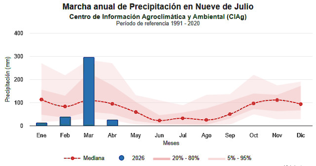 Y añadió: "Por ejemplo, se pueden mencionar las precipitaciones registradas en la localidad bonaerense de Nueve de Julio, que en marzo acumuló más de 290 mm. Este volumen supera el doble del valor medio de las lluvias mensuales del mes —139 mm—, según las estadísticas del período 1991-2020".