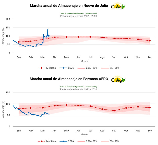 "En Nueve de Julio —al NO de Buenos Aires—, como decía anteriormente, la disponibilidad de agua hasta un metro de profundidad es favorable. En cambio, en Formosa, la oferta hídrica es escasa y se mantiene por debajo de los valores medios desde principios de año", explicó.