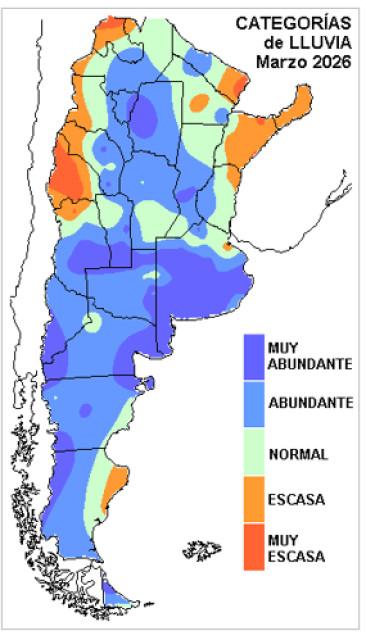 La escasez de lluvias se recorta sobre sectores de la Mesopotamia y se insinúa sobre el NEA, donde a pesar de la irregularidad pluvial, mayoritariamente se alcanzaron totales cercanos a los normales. El NOA, favorecido por una dinámica que no fue alterada por la pisada anticiclónica de la Mesopotamia, logro alternar zonas con sobreoferta de agua. Esto se proyecta hacia gran parte de CB y el litoral, antes de ingresar a la provincia de BA, donde, sobre todo hacia el centro sur, se destacan los desvíos de lluvia más notorios. Hay zonas del centro de BA, donde los totales superaron los trescientos milímetros. Si bien gran parte el centro sudeste bonaerense necesitaba altos volúmenes de lluvia para corregir el atraso pluvial que dejo el verano, este comportamiento resulto en graves problemas urbanos en algunas localidades y anegamientos en áreas rurales. También la estadística confirma con desvíos positivos, la beneficiosa mejora de las lluvias en gran parte de la Patagonia, aunque en términos relativos el este rionegrino es que el que se lleva el premio mayor y encuentra un fuerte aliado para el desarrollo de las pasturas.