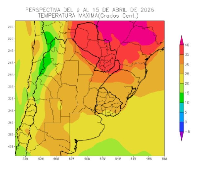 El este del NOA, el sudoeste de la Región del Chaco, el este de Cuyo, la mayor parte de la Mesopotamia, el norte de la Región Pampeana y el oeste del Uruguay obser-varán temperaturas máximas superiores a 25°C, con un amplio foco con valores superiores a 30,35 y 40°C, y focos con valores inferiores.