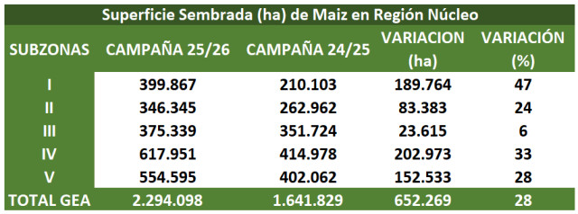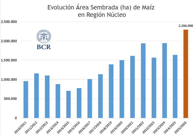 Aún con contratiempos en la cosecha, la campaña de maíz en la región núcleo se encamina a un resultado histórico impulsado por la expansión del área sembrada. La estimación inicial de 1,87 M ha quedó atrás tras el ajuste realizado con imágenes satelitales, que permitió detectar 419.000 ha adicionales y elevar el total a 2,29 M ha. El dato surge del trabajo de clasificación de uso del suelo de GEA/BCR, que incluyó la georreferenciación de 2.100 puntos de distintas coberturas en la región núcleo, procesados en la plataforma Google Earth Engine a partir de imágenes Sentinel-2. El resultado no deja dudas: se trata de la mayor superficie sembrada de los últimos 16 años.