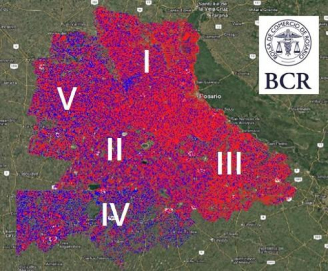 Los puntos azules representan al maíz y dominan hacia el oeste, mientras que los rojos a la soja y se nota que ganan en densidad hacia el este. La imagen muestra un quiebre bien marcado entre el oeste y el este. El maíz pisa fuerte especialmente en las subzonas IV, V y II, donde se impone en el paisaje agrícola.