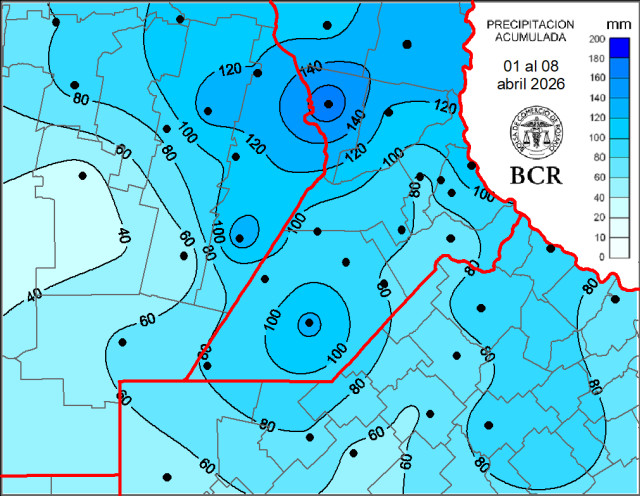 En los primeros 8 días de abril, el promedio de lluvias de la región fue de 90 mm y ya alcanzó el valor medio de lo que suele llover en todo el mes (que va de 70 a 100 mm, de oeste a este). Los mayores registros se concentraron sobre el sudeste de Córdoba y el sur de Santa Fe, donde se destacan Montes de Oca con 178,5 mm, Irigoyen con 141 mm y Guatimozín con 135 mm. Mientras que en el noroeste bonaerense y sectores del sur cordobés presentaron acumulados considerablemente menores, con mínimos en Bengolea (30,5 mm), Canals (42 mm) y General Villegas (49 mm).